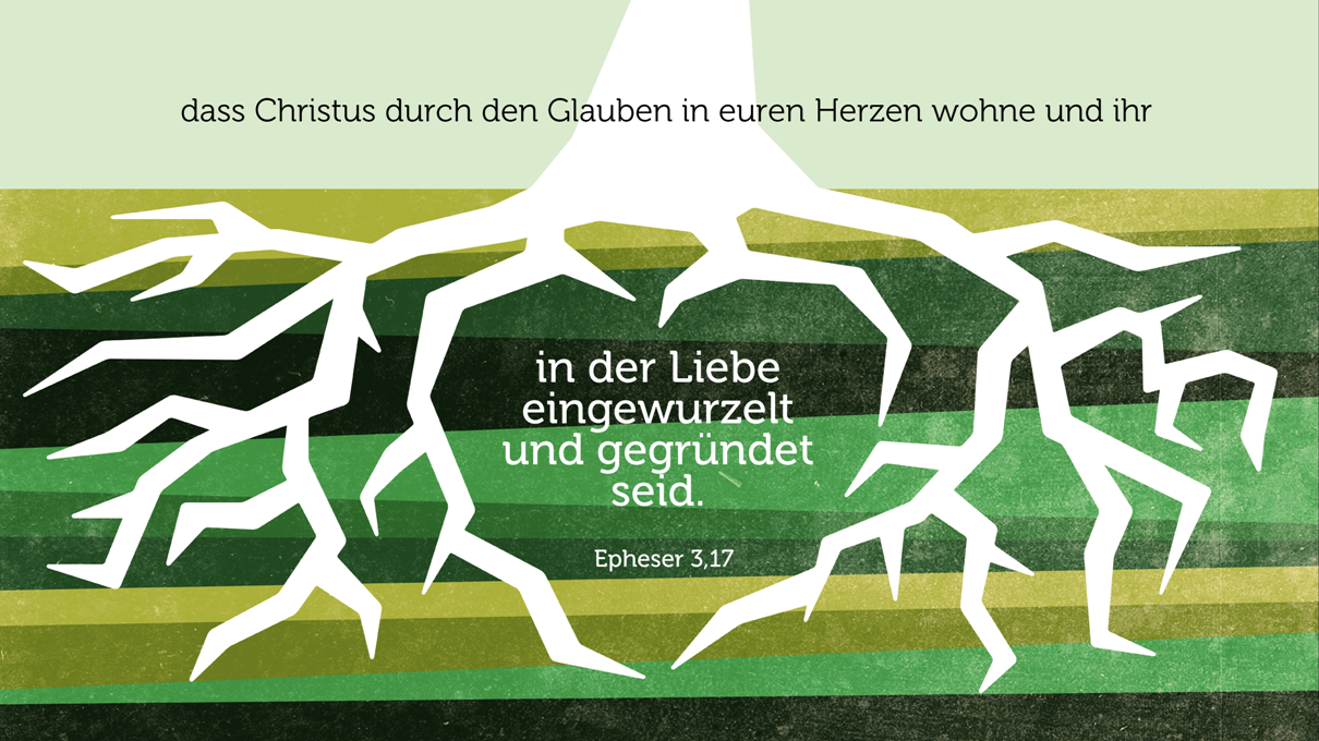 „Dass der Christus durch den Glauben in euren Herzen wohne und ihr in Liebe gewurzelt und gegründet seid, damit ihr imstande seid, mit allen Heiligen völlig zu erfassen, was die Breite und Länge und Höhe und Tiefe ist, und zu erkennen die die Erkenntnis übersteigende Liebe des Christus, damit ihr erfüllt werdet zur ganzen Fülle Gottes.“
